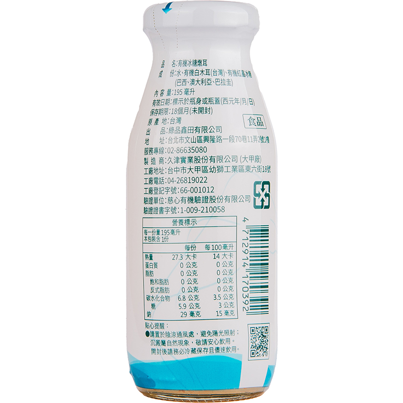 成分:水、有機白木耳(台灣)、有機紅晶冰糖(巴西)